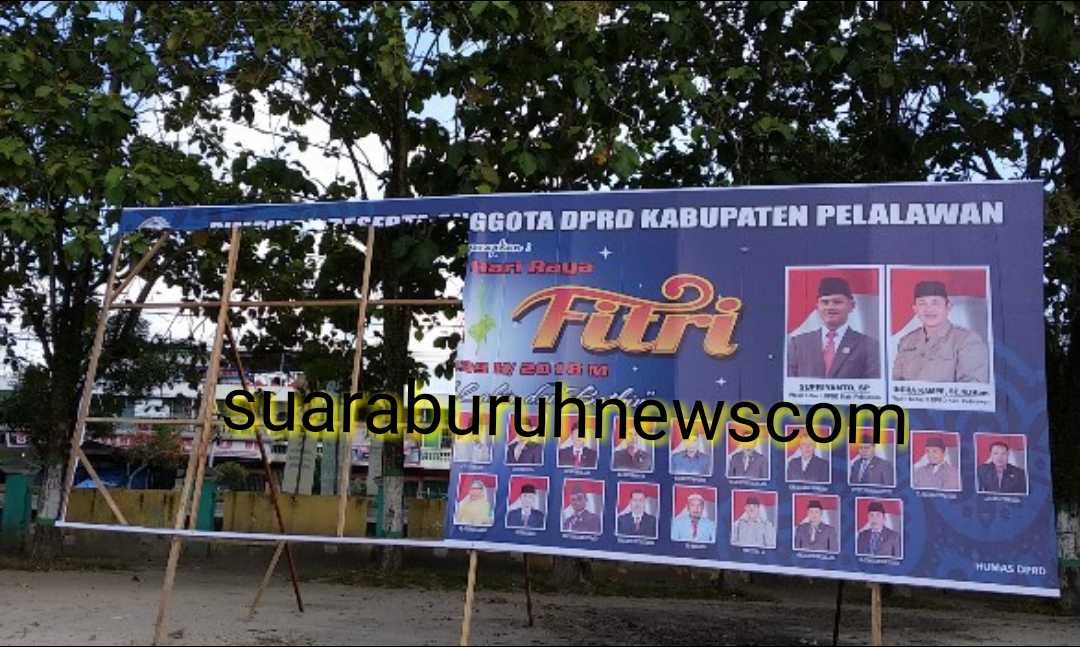 Baliho yang dibuat oleh Humas DPRD Kabupaten Pelalawan itu di pasang pas bagian barat atau arah kiblat di lapangan bola kaki yang tak jauh dari shaf sholat ied yang digelar besok pagi.